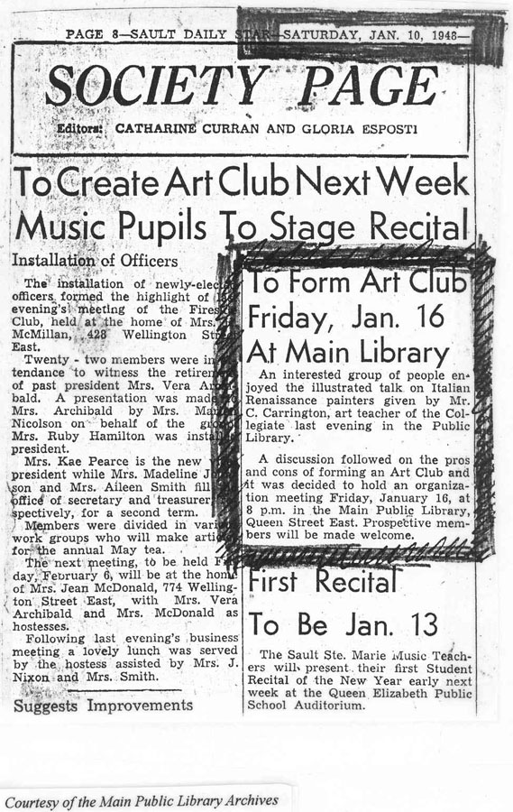 - Sketching Class - each Friday, 7-9 p.m. in children’s library room at Sault Ste. Marie Public Library - under leadership of Mr. Carrington, Collegiate Institute art instructor