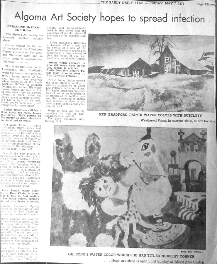 - May, 1971 - massive show, Allied Arts Centre gymnasium - show opened by Zoltan Szabo - members and non-members exhibit