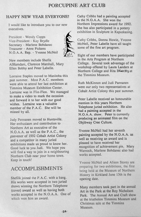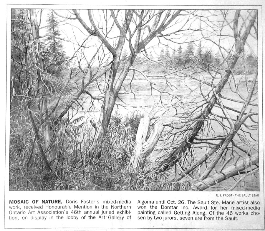 - 37th Annual NOAA Juried Painting Exhibition – Opened Sept. 13, 1993 – Englehart – jurors Dr. Anita Spadafore and Clement Berini - Inco Ltd. Award – Doris Foster - Cousin Llewellyn – Coloured Pencil