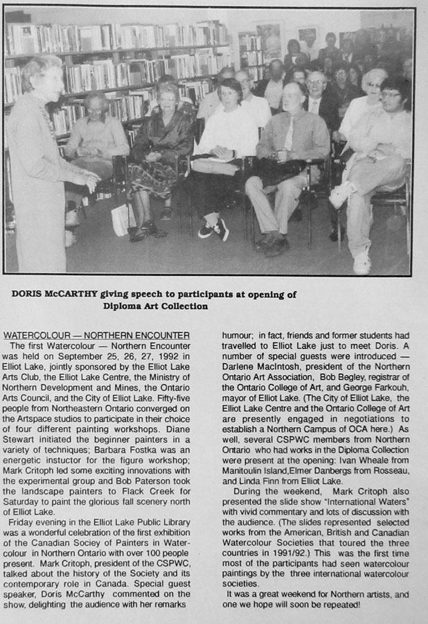 - 39th Annual NOAA Juried Painting Exhibition – Opened Sept. 15, 1995 – Elliot Lake – jurors Dan Solomon and Cylla von Tiedemann - Grant Forest Products Award – Zoey Wood-Salomon, Doris Foster and Jeannette Clarida accepted