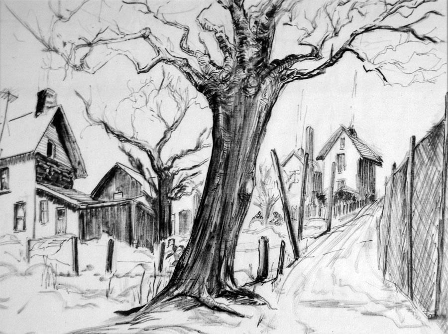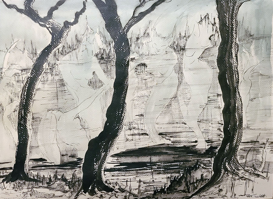 Rita Tuckett (deceased) - accepted in NOAA 12 times – examples of her artwork. The black and white art piece with three trees and faint images of figures dancing in the background was titled Dryads of the Morning for a price of $15.00.